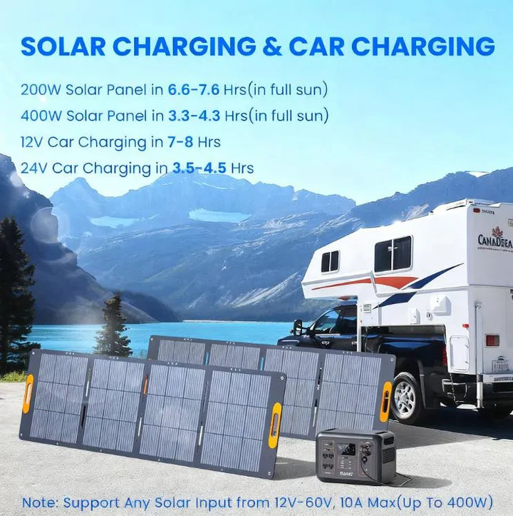 - Solar Charging: Supports DC12V~60V input with a maximum current of 10A and a maximum power of 400W. When paired with a solar panel, it can charge using clean energy, making it environmentally friendly and convenient.